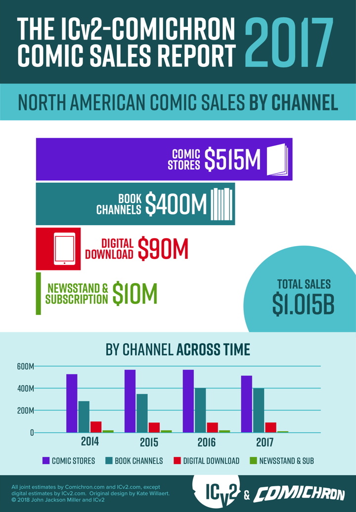 The comics and graphic novel market slipped 6.5% in 2017, with sharper declines in comic store and newsstand sales mitigated by stronger sales in the book channel and digital, according to a new joint estimate by ICv2’s Milton Griepp and Comichron’s John Jackson Miller. Total comics and graphic novel sales to consumers in the U.S. and Canada remained above $1 billion at $1.015 billion in 2017, a $70 million decrease from sales in 2016.
