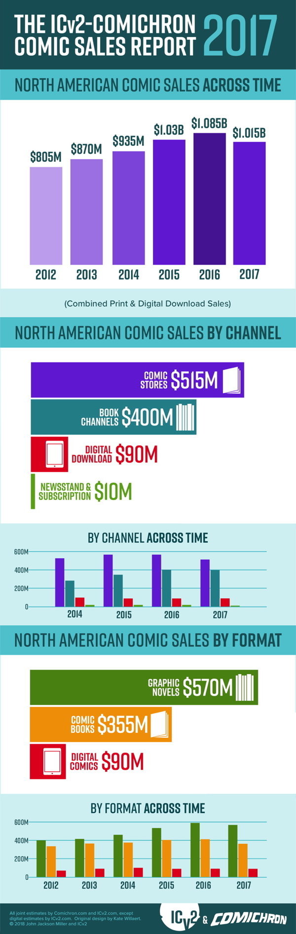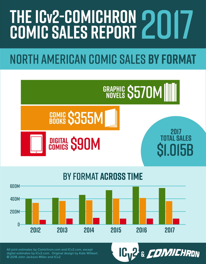 As presented above and in the accompanying infographics, the analysis by Comichron and ICv2 was divided up between periodical comics, graphic novels, and digital download-to-own sales. All print figures are calculated based on the full retail price of books sold into the market, and do not account for discounting or markup. Digital sales do not include subscription or “all you can read” services.