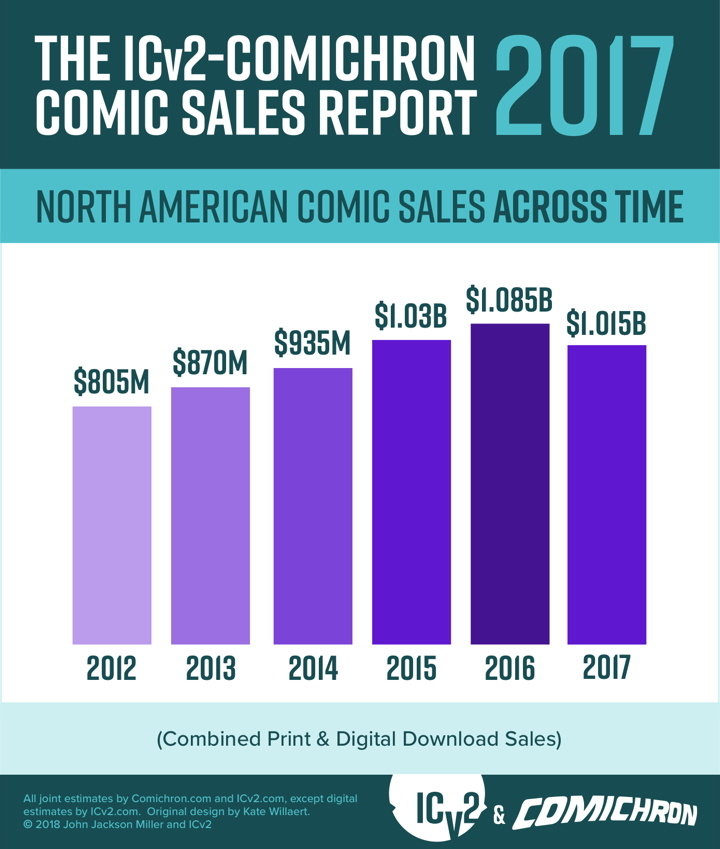 This is the fifth joint market size analysis from ICv2 and Comichron; the first four reports were for 2013, 2014, 2015, and 2016 sales. ICV2 and Comichron also previously collaborated on revised estimates for 2011 and 2012.